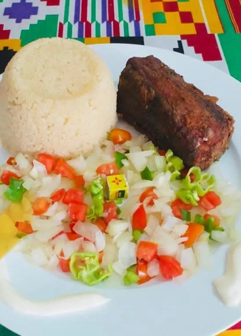 Savourez notre délicieuse assiette composée de poissons juteuse accompagnée dune boule attieke moelleux et coloré de légumes frais. Parfait pour un déjeuner équilibré et savoureux.