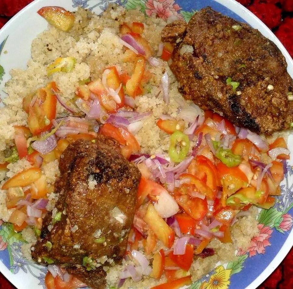 Découvrez un délicieux plat de Garba accompagné de poisson Tom grillé, oignon, tomate, piment, magi, mayonnaise. Parfait pour un repas sain et savoureux, idéal pour toute la famille.