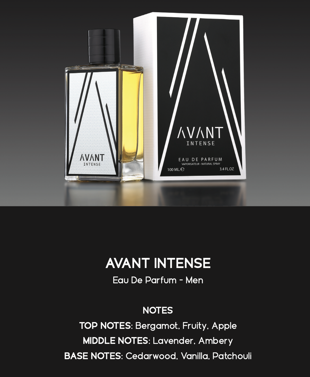 Découvrez Avant Intense, une eau de parfum captivante pour hommes. Avec des notes de tête de bergamote, fruité et pomme, il séduit immédiatement. Les notes de cœur de lavande et ambré apportent une chaleur enveloppante, tandis que la base de cèdre, vanille et patchouli crée une profondeur irrésistible. Parfait pour l'homme moderne recherchant élégance et sophistication. Idéal pour toutes les occasions spéciales.