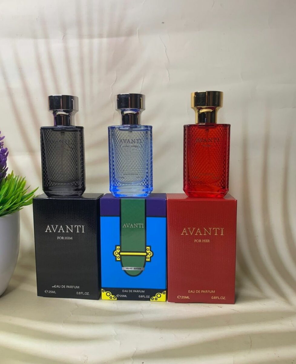 Avanti parfum 25ml disponible en 3 fragrances Rouge for her Noir for him Bleu unisexe