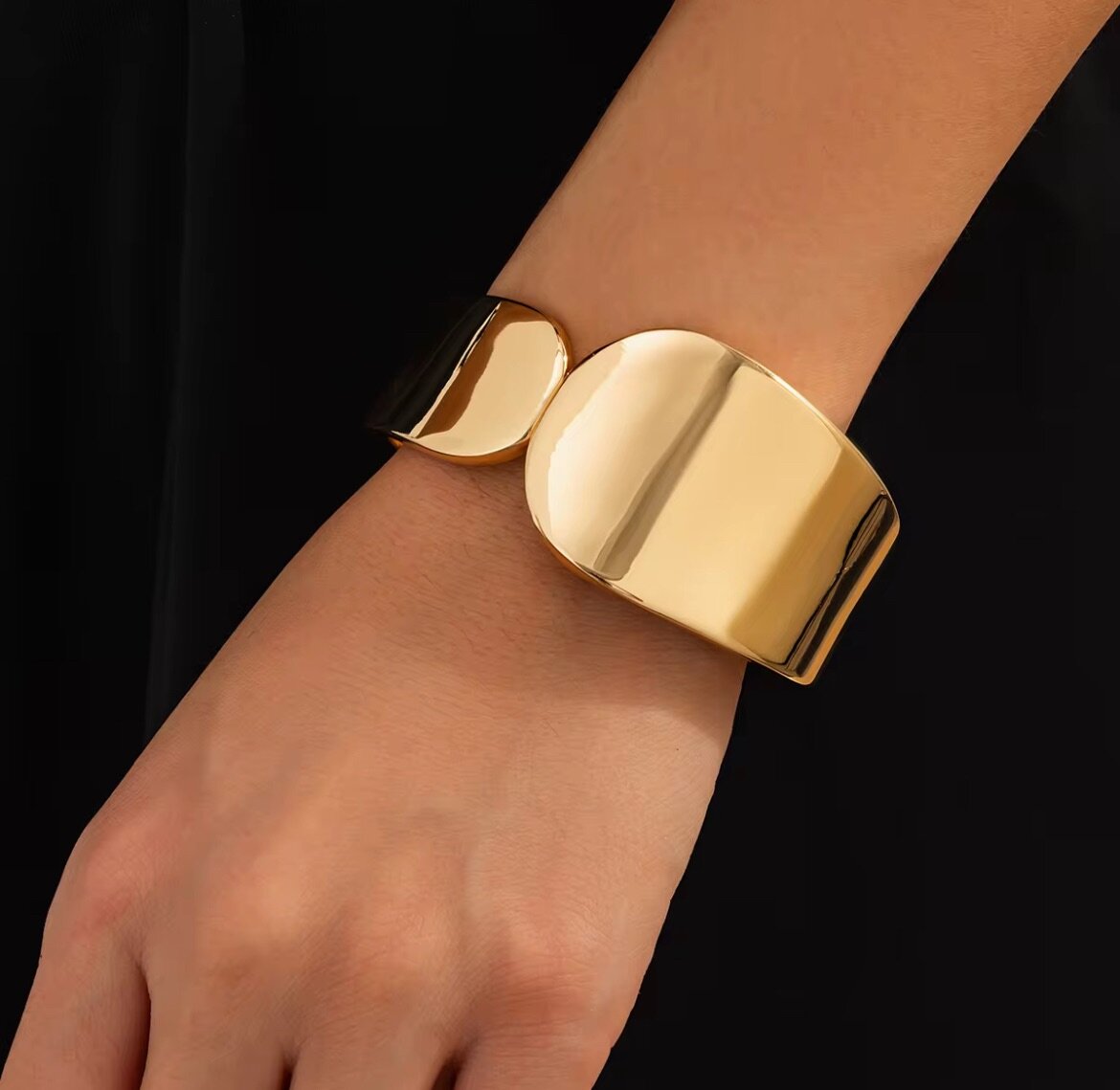 Avec son design large et sculpté, ce bracelet doré se distingue par sa forme audacieuse et sa finition brillante, idéal pour un look élégant et affirmé.