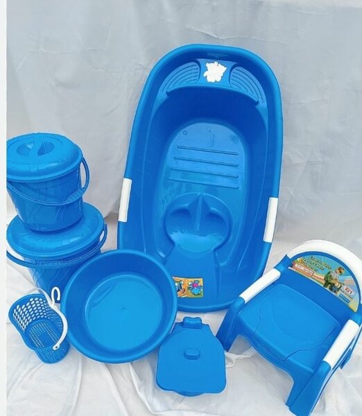 Set of baby bathing items. Conviniently bath your child with this tub set, having a stool, tub, potty, bucket, cup etc.