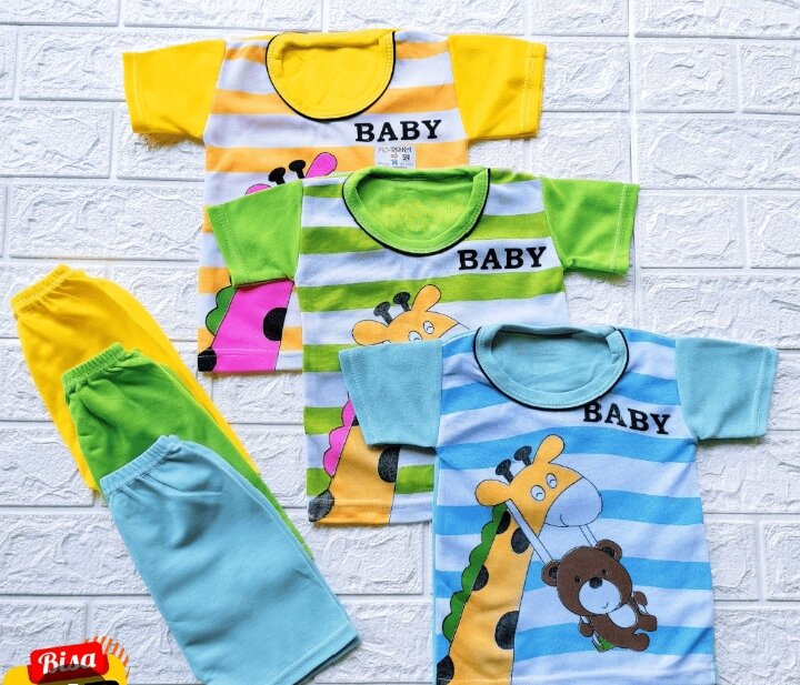 Il s'agit spécifiquement d'ensembles T-shirt à manches courtes et short/pantalon court, idéaux pour les tout-petits, avec des motifs enfantins (girafes et ours) et des couleurs vives.