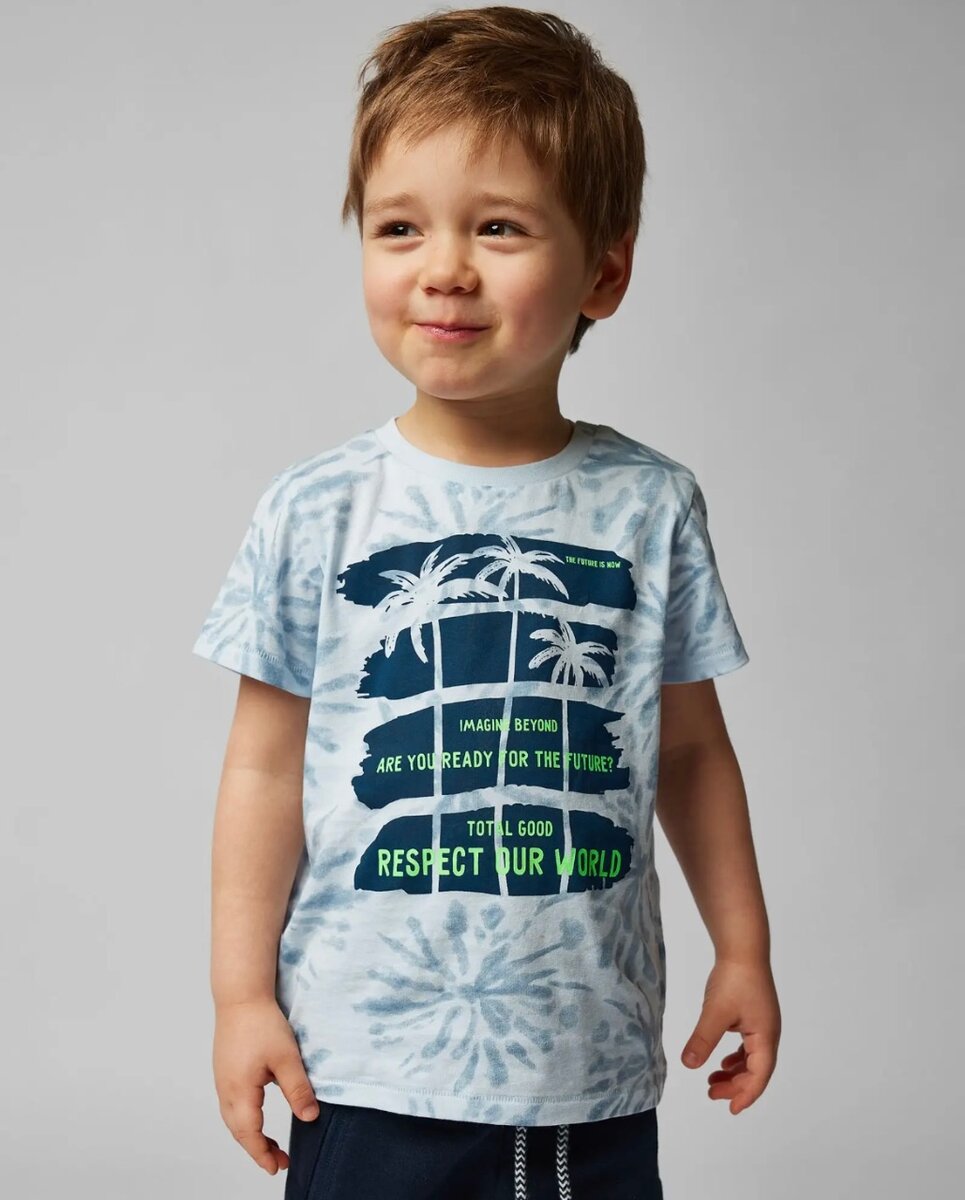 Голубая футболка для мальчика Baby Go в стиле "тай-дай" с контрастным принтом. 100% хлопок Застёжки-кнопки на плечике Короткий рукав Рост модели - 98 см На модели размер 92