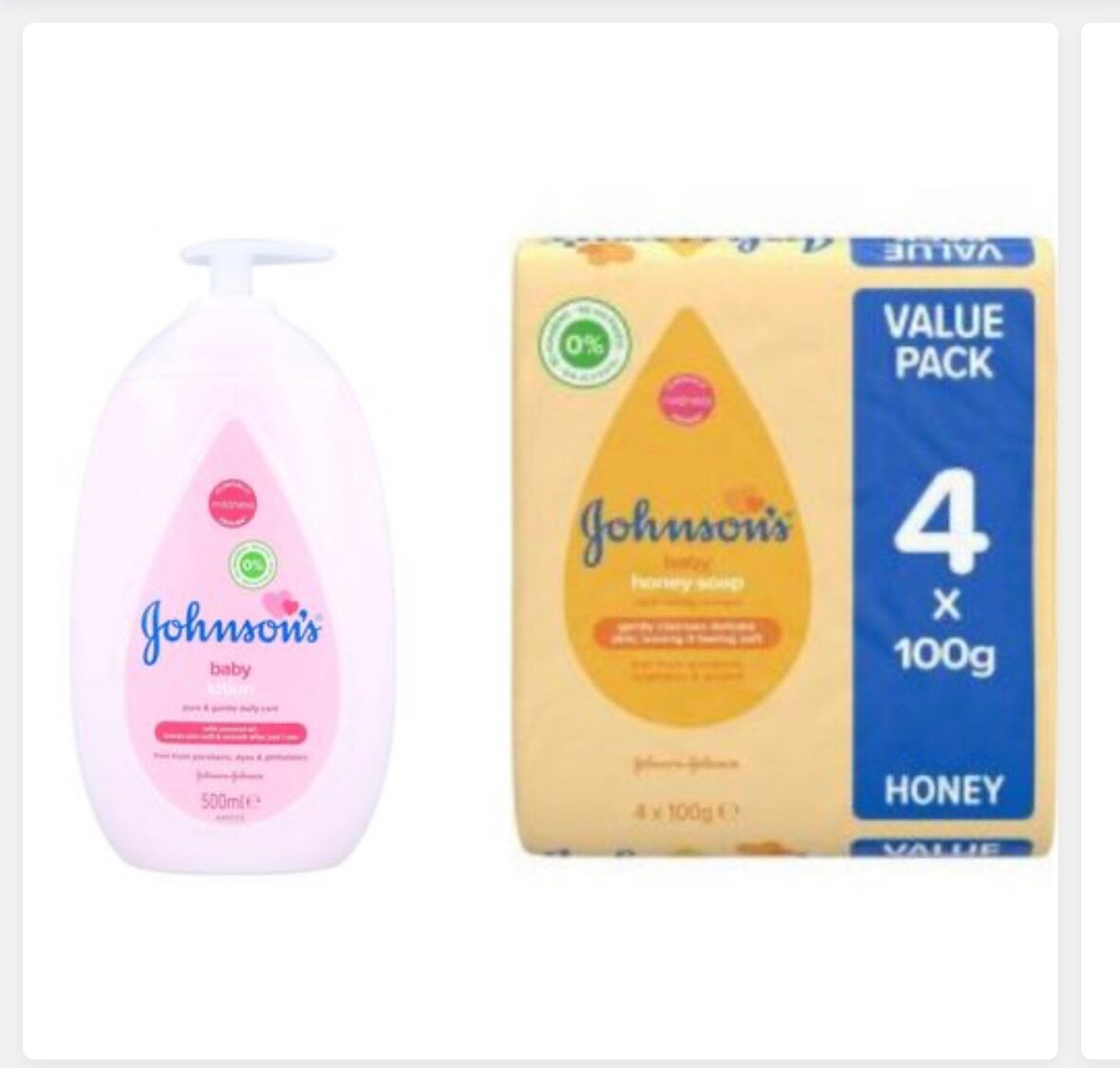 1 lot de 4 savons de baby johnsons plus le lait de 500 ml. Hypoallergenique ideal pour une peau douce de votre enfant. Utilisable deh la naissance .