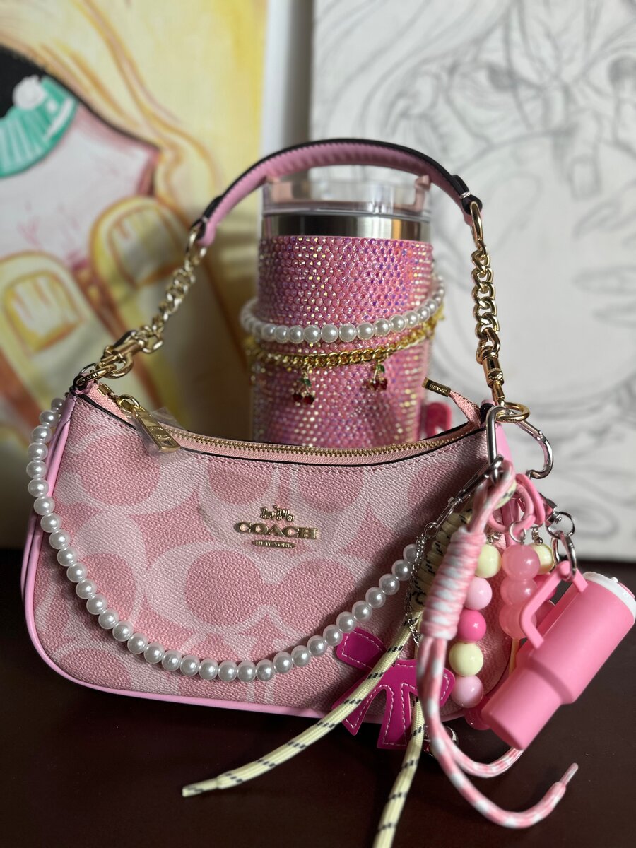 Chic Coach pink handbag with elegant pearl accents, perfect for elevating any outfit. Compact yet spacious, it's ideal for daily use or evening outings. Add a touch of luxury to your style.