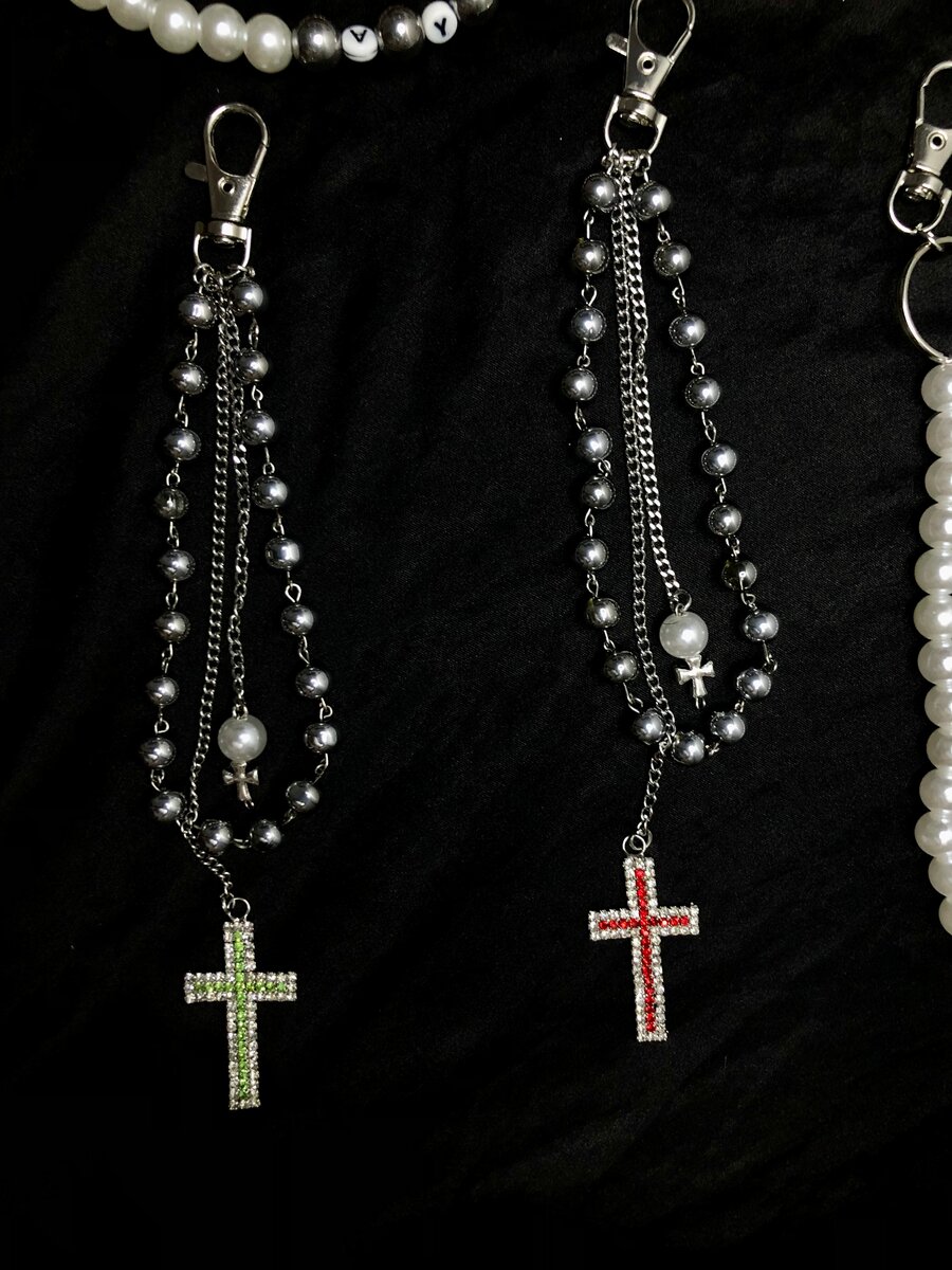 Ajoutez une touche élégante avec des chaînes pour vos pantalons et sacs. Décorés de perles et d'une croix scintillante.