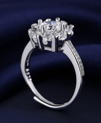 Éblouissante bague de fiançailles en forme de fleur sertie de diamants étincelants. Ce bijou élégant est idéal pour marquer une occasion spéciale. Fabriquée avec précision, elle incarne le luxe et le raffinement.