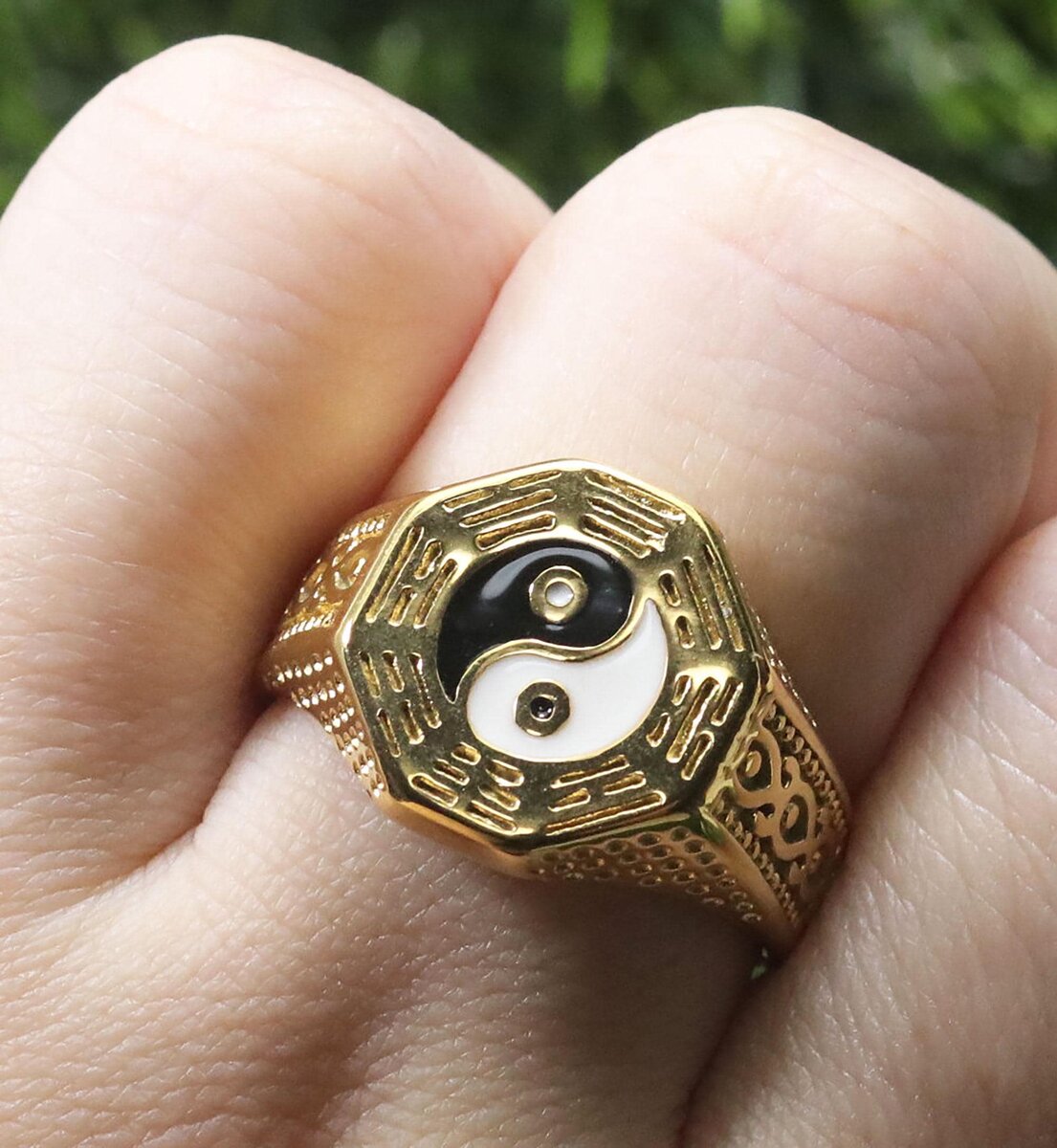 Ajoutez une touche d'élégance avec cette bague dorée ornée du symbole Yin Yang. Idéale pour les amateurs de spiritualité et de style unique. Fabriquée avec soin pour offrir confort et durabilité, elle est parfaite pour un usage quotidien ou des occasions spéciales. Exprimez votre équilibre intérieur avec élégance.