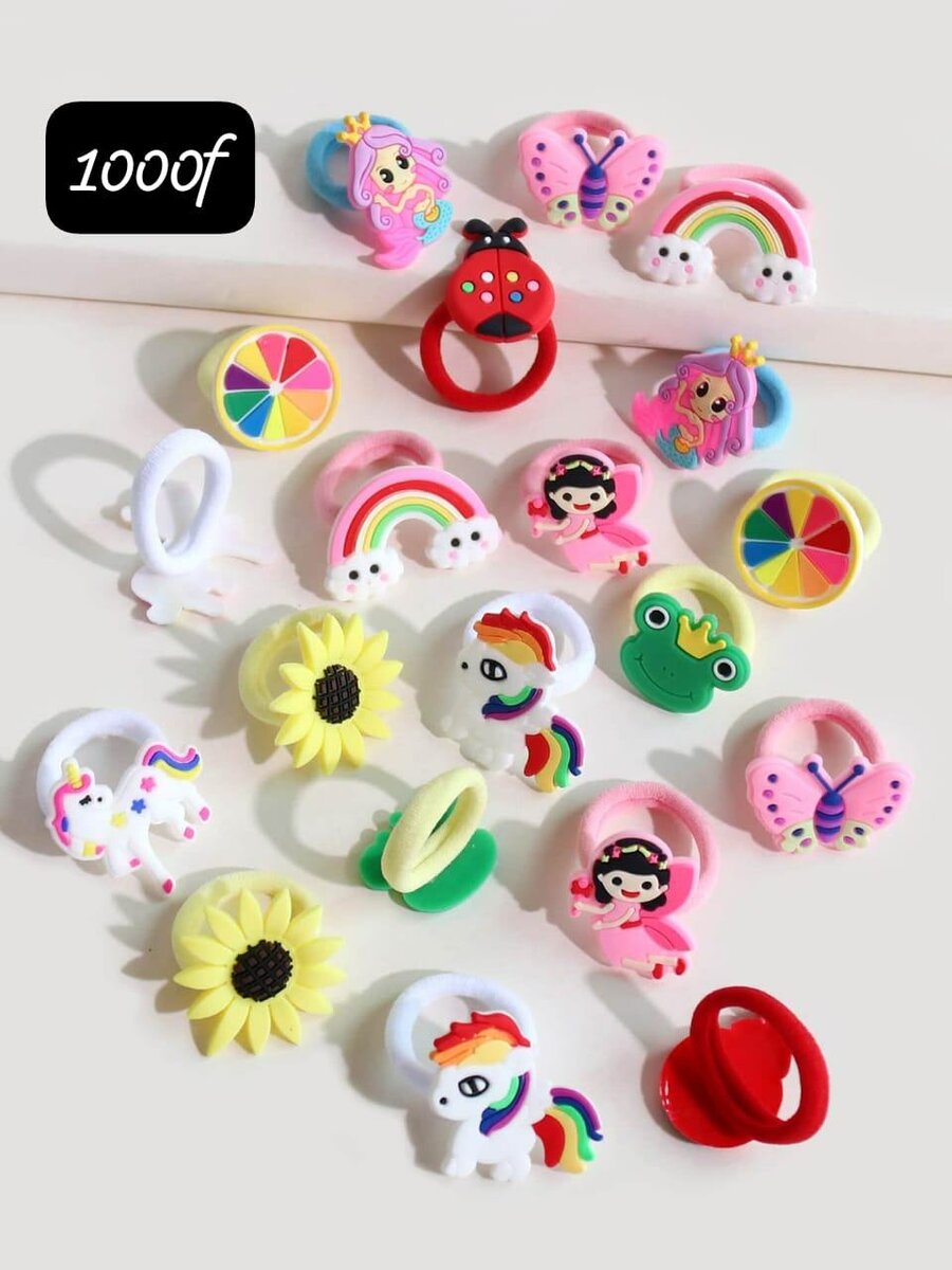 Lot de bagues élastiques colorées pour enfants. Motifs d'animaux, fleurs et arcs-en-ciel. Parfait pour jouer et collectionner, ces bagues ajoutent une touche de fantaisie. Fabriquées en plastique résistant. Idéal pour les cadeaux d'anniversaire ou les fêtes.
