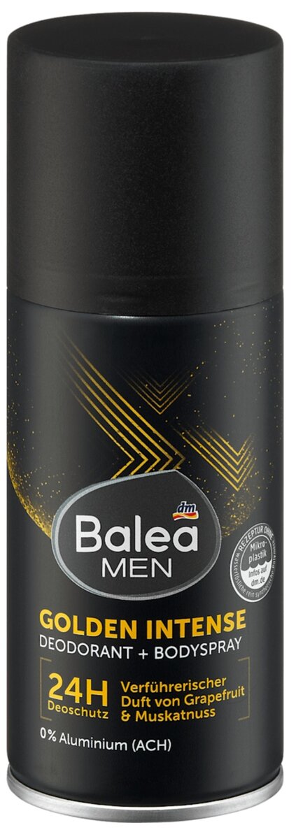 Déodorant corps Balea Men Golden Intense, protection 24H, parfum séduisant de pamplemousse et muscade, sans aluminium.