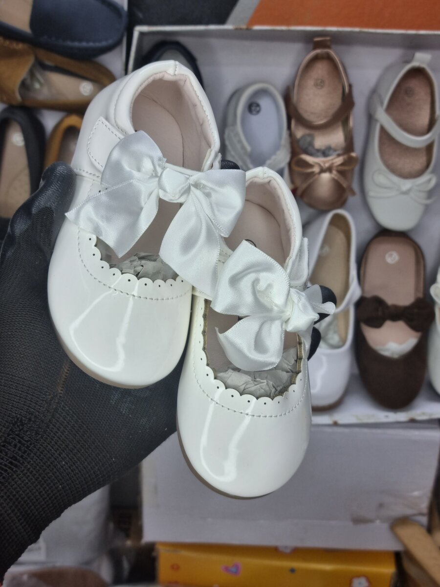 Charmantes ballerines blanches avec nœuds, idéales pour occasions spéciales et tenues quotidiennes. Confortables et stylées, parfaites pour les petites filles.
