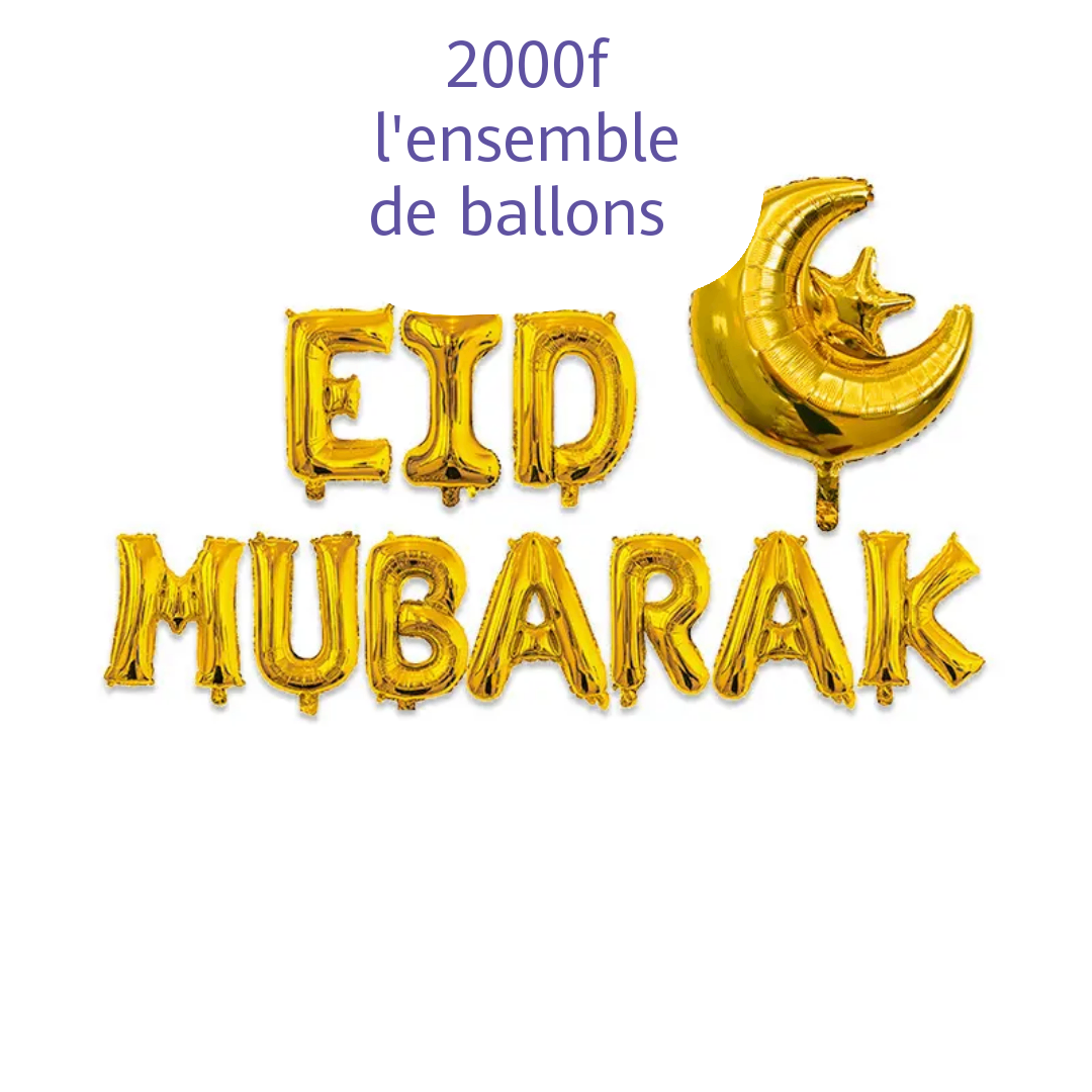 Ensemble de ballons dorés 'Eid Mubarak'. Idéal pour célébrations festives et décoration élégante.