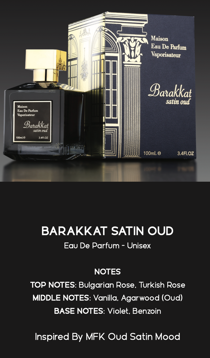 Découvrez Barakkat Satin Oud, un parfum unisexe captivant avec des notes de rose bulgare et turque, vanille et bois d'agar. Idéal pour une touche de luxe au quotidien.