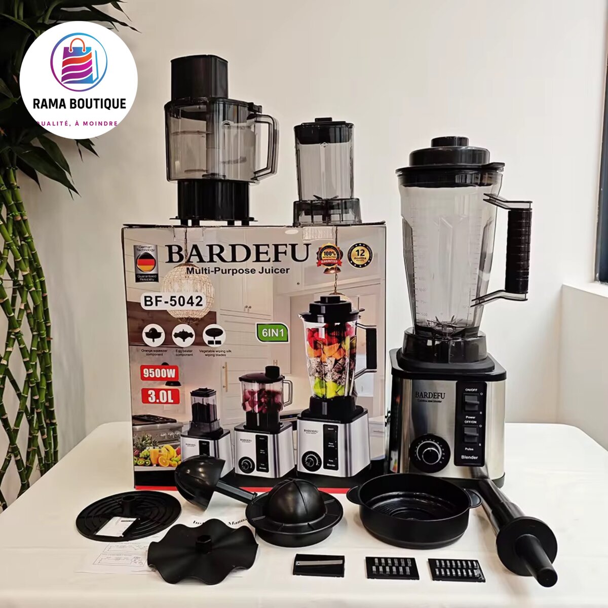 Découvrez le mixeur multifonction BARDEFU BF-5042, idéal pour vos besoins culinaires. Avec 9500W de puissance, son grand bol de 3.0L et ses accessoires polyvalents, il mixe, hache, broie et bien plus. Parfait pour smoothies, soupes et jus frais. Un essentiel pour toute cuisine moderne.