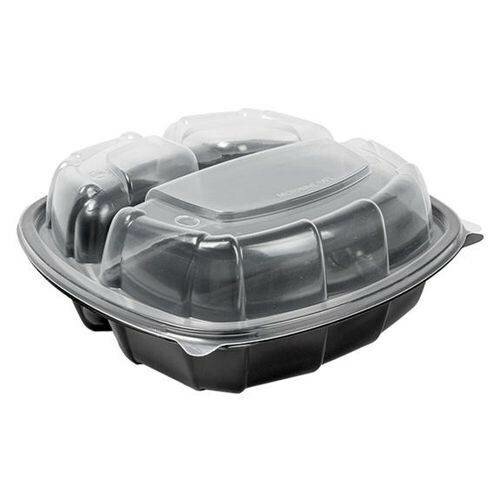 Barquette 3 compartiments micro-ondables noir et couvercle transparent en pp 1170 ml, lot de 50 pcs. Parfait pour réchauffer les aliments et les garder au chaud sous des lampes thermiques.