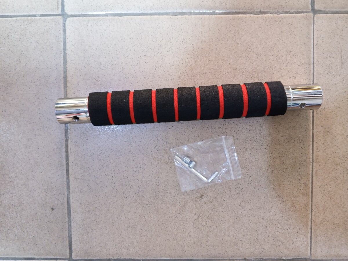 Barre de traction murale en acier robuste avec poignée en caoutchouc noir et bandes rouges. Idéal pour les exercices de musculation à domicile. Livré avec les vis de fixation.