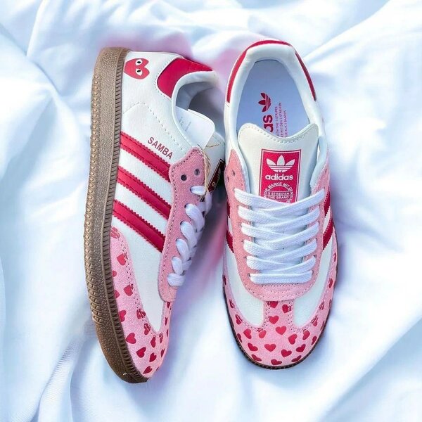 Craquez pour les baskets Adidas Samba en édition spéciale avec imprimé cœurs roses. Ces sneakers combinent style et confort avec leurs bandes classiques et une semelle robuste. Idéales pour apporter une touche d'amour à votre tenue quotidienne.
