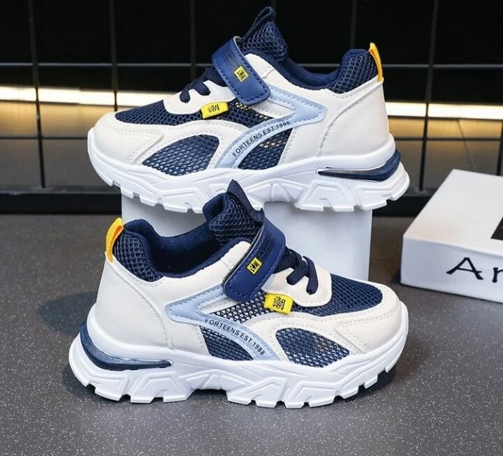 Idéales pour l'activité physique, ces baskets offrent confort et style. La combinaison de bleu et blanc avec des détails respirants assure une bonne aération, parfaite pour les enfants actifs.