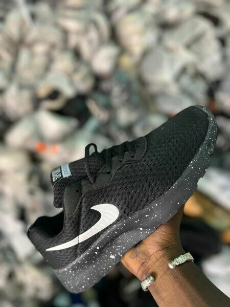 Baskets running noires/blanc moucheté, look tendance, maille légère, semelle solide. Pour sport ou ville. Modèle neuf.