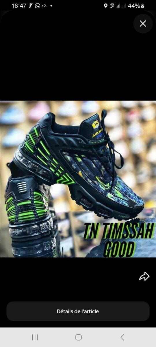 Découvrez le style et le confort des baskets TN Timssah. Parfaites pour un look urbain, elles allient modernité et performance avec leurs motifs noirs et verts. Idéales pour la ville ou le sport.