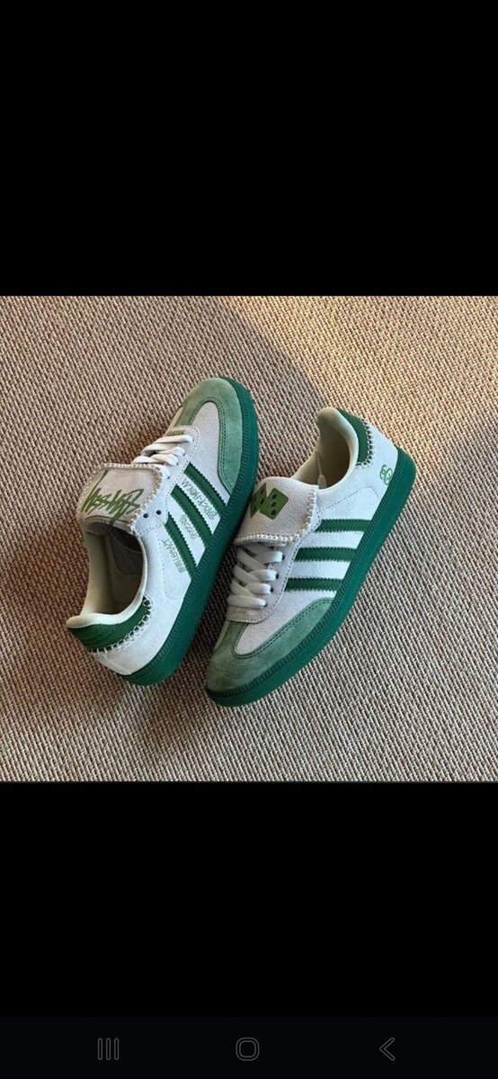 Baskets confortables en daim avec rayures vertes. Parfaites pour le sport ou le style décontracté. Semelle résistante et design moderne.