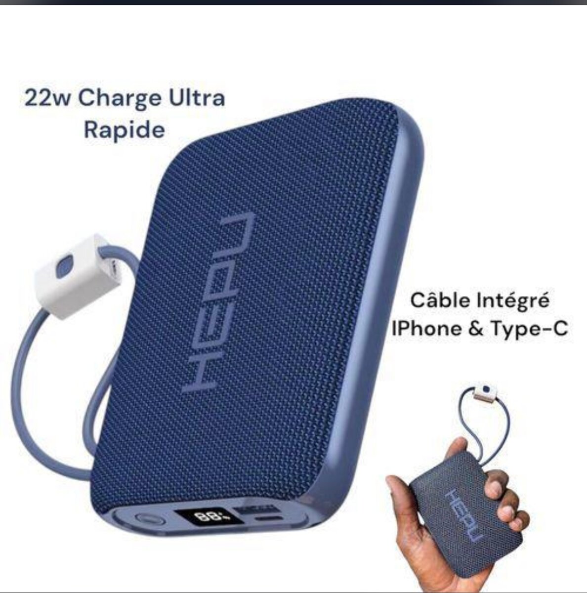 Découvrez la batterie externe HEPU 22W, idéale pour des recharges ultra rapides. Avec son câble intégré compatible iPhone et Type-C, elle est parfaite pour vos déplacements. Design compact, facile à transporter, c'est le choix parfait pour maintenir vos appareils toujours chargés.