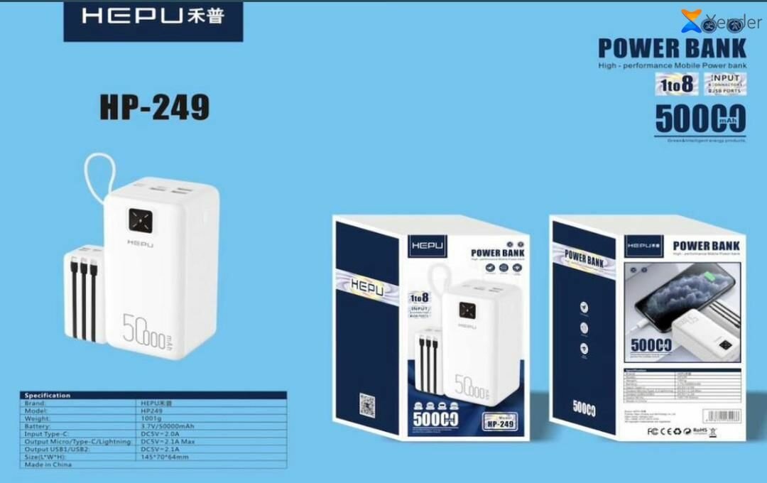 Optez pour la batterie externe HEPU 50000mAh pour une recharge rapide et efficace de vos appareils. Compatible avec divers équipements, elle est idéale pour les voyages et le quotidien. Son design compact offre une capacité énorme pour une autonomie prolongée.