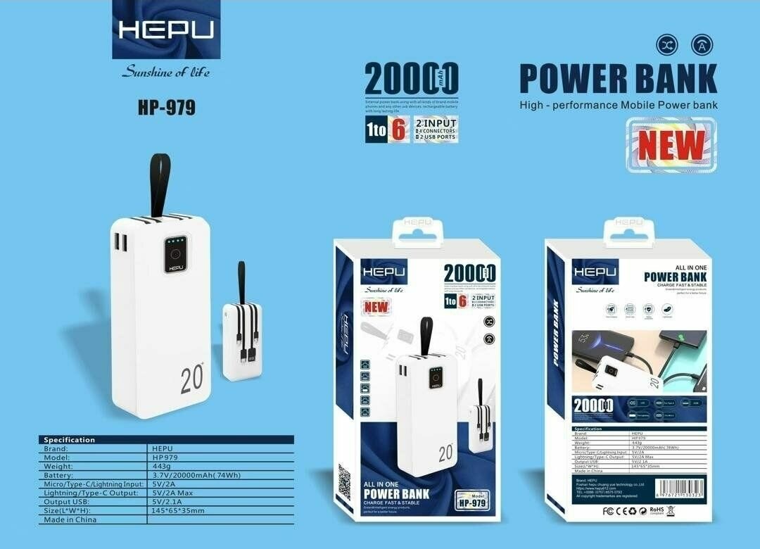 Découvrez la puissance de la Batterie Externe HP-979 avec une capacité de 20000mAh. Chargez vos appareils en toute confiance grâce à sa technologie avancée. Idéale pour les voyages, elle assure une autonomie prolongée et une compatibilité étendue.