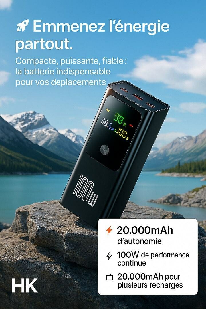 Emportez votre énergie partout avec cette batterie portable puissante de 20000mAh et 100W. Compatible avec ordinateurs portables, iPhones et iPads, elle est idéale pour les déplacements. Rechargez plusieurs appareils en toute fiabilité.