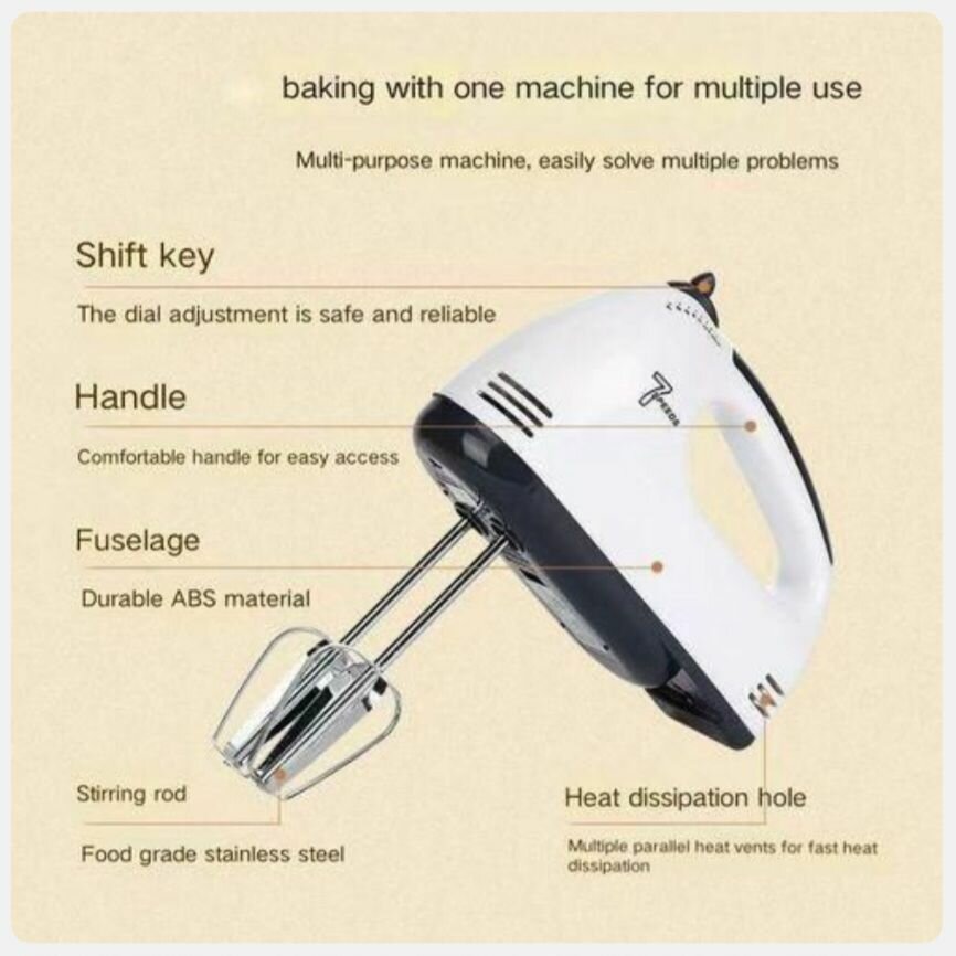 Découvrez le batteur électrique multifonction 300W avec moteur en cuivre pur et 7 vitesses. Idéal pour battre les œufs, mélanger et préparer des milkshakes. Compact et puissant, c'est l'outil parfait pour répondre à tous vos besoins de pâtisserie. Sa conception double tige rend le brassage plus facile et efficace. Parfait pour les amateurs de cuisine créative.