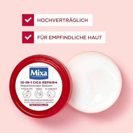 Le baume corporel réparateur 10-en-1 Cica Repair+ de Mixa est le soin idéal pour les peaux sèches et gercées des coudes, genoux, pieds et mains. Sa formule enrichie contient 40 % de glycérine, de l'urée et de l'allantoïne. Il pénètre rapidement et hydrate intensément la peau.
