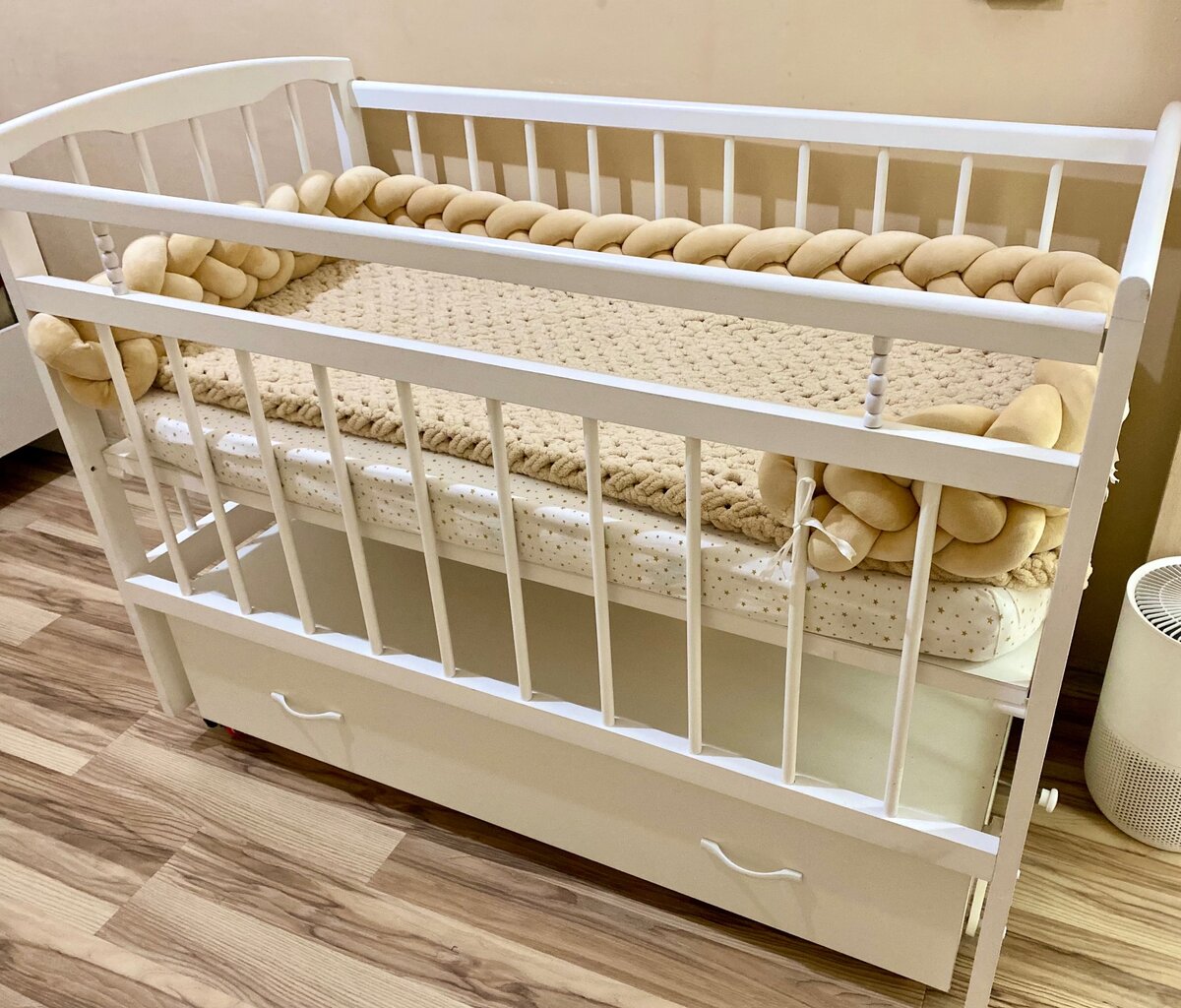 У кроватки два положения высоты ложа. Опускается боковая планочка, можно приставлять к кровати. Есть два вместительных ящика.