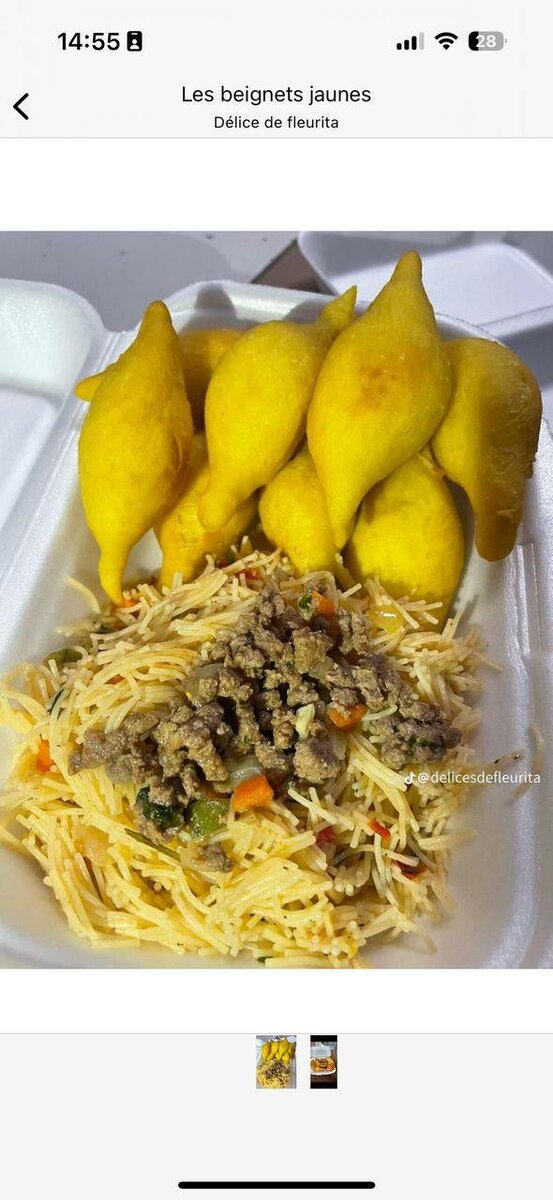 Savourez nos beignets jaunes moelleux accompagnés de nouilles savoureuses garnies de viande hachée. Un délice pour les gourmands à déguster à tout moment.