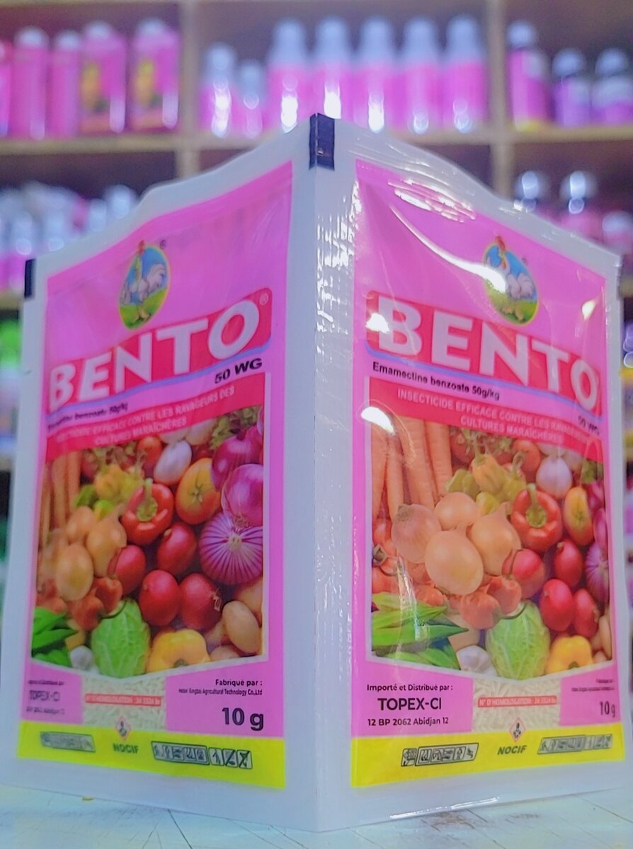 BENTO 50 WG agit en inhibant la contraction musculaire, provoquant un flux continu d'ions chlore dans les sites récepteurs du GABA et du H-glutamate.Il perturbe les neuro- transmetteurs, ce qui provoque une paralysie irréversible qui conduit à la mort de l'insecte.