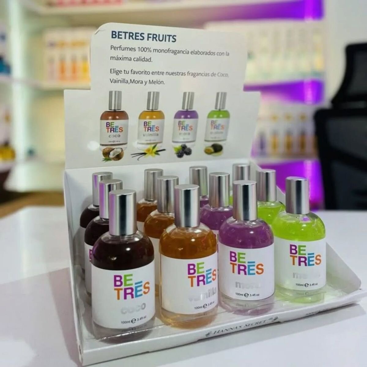 Découvrez les parfums rafraîchissants de BETRES Fruits. Un coffret de fragrances exotiques comme Coco, Vanille, Mora, et Melon. Idéal pour un cadeau parfumé ou un plaisir personnel, offrant une touche fruitée à chaque journée.