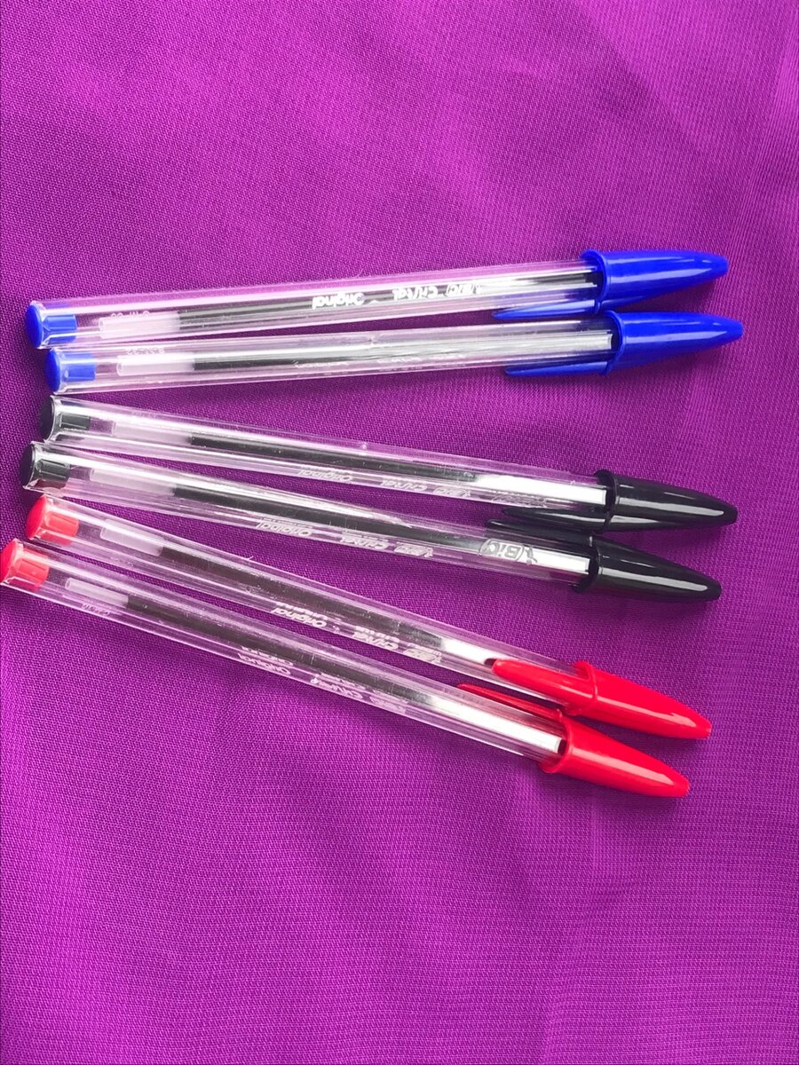 2 stylos bleus,2 stylos rouges et 2 stylos noirs de la marque Bic à 500 fr. Des stylos originaux.