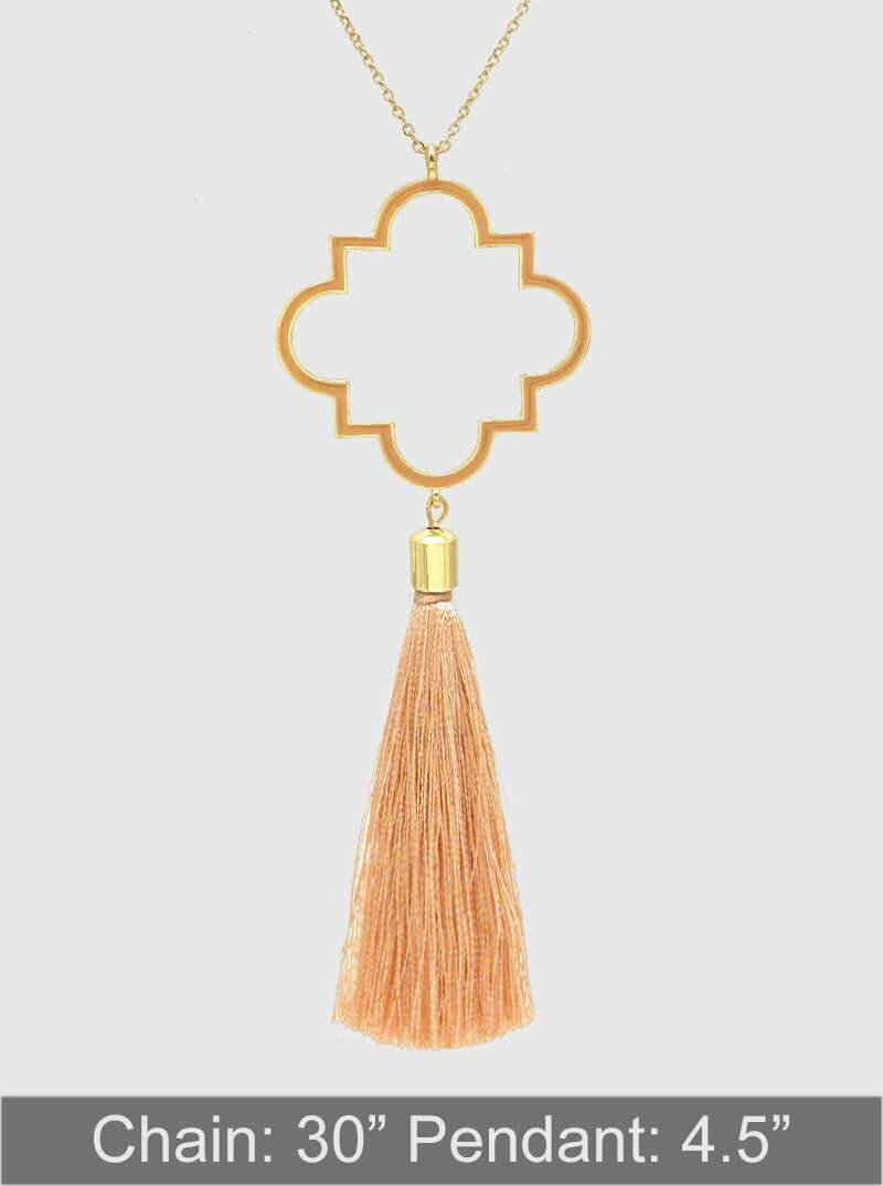Pendentif en forme de quadrilobe rempli d'émail avec un long collier à pampilles en fil Couleur : DORÉ-ROSE FONCÉ Longueur: 30 POUCES AVEC PENDENTIF D'EXTENSION DE 2 POUCES : 4,5 POUCES Matériel : Alliage de zinc et fil