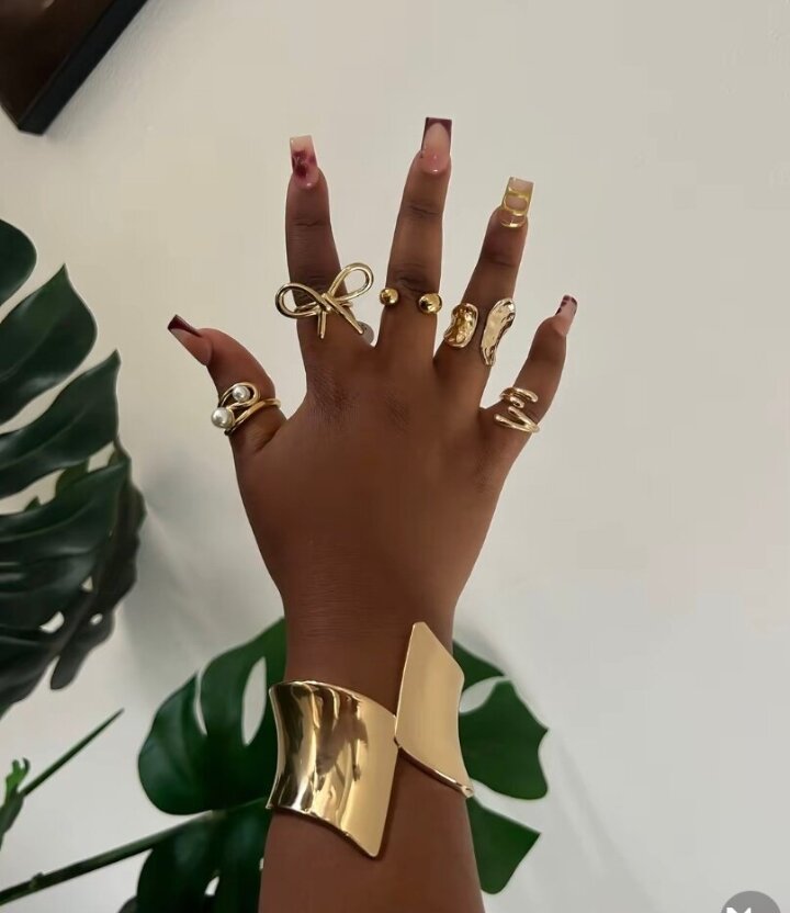 Élégant ensemble de bagues et bracelet en or, parfait pour ajouter une touche glamour à toute tenue. Idéal pour les occasions spéciales ou un usage quotidien.