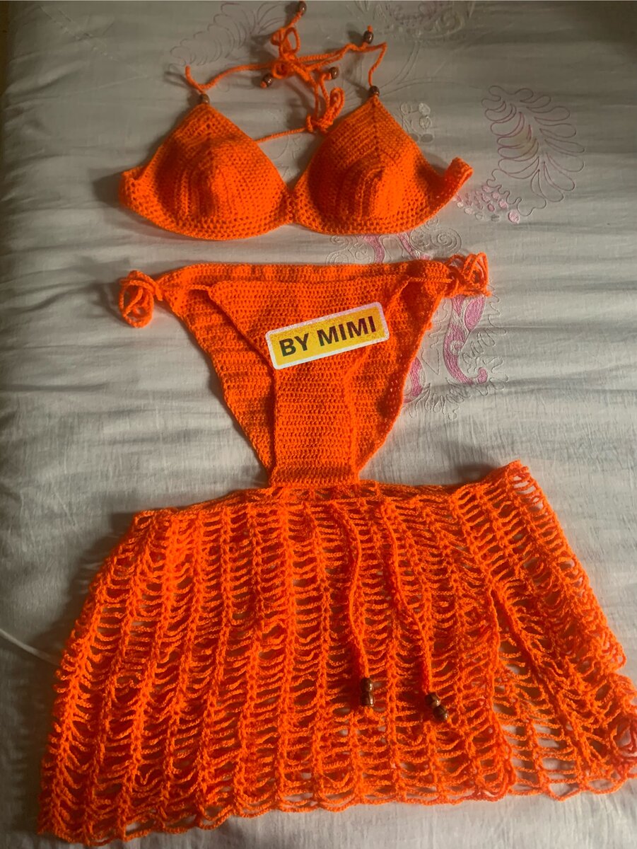 Ce bikini crochet orange vibrant est parfait pour l'été. L'ensemble comprend un haut de style triangle réglable, un bas échancré et une jupe légère à motifs ouverte. Idéal pour la plage ou la piscine, il offre confort et style. Ce maillot de bain ajoutera une touche de couleur et de fun à vos journées ensoleillées.