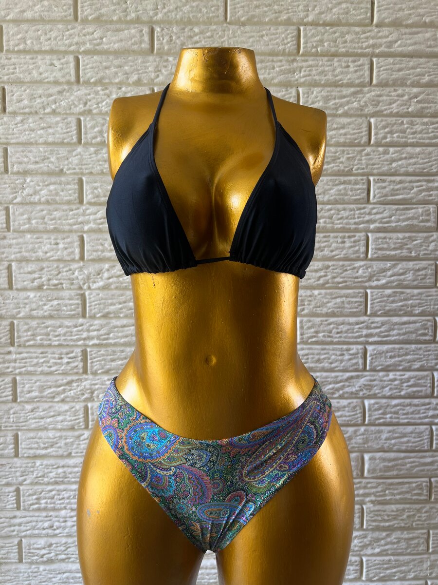 Adoptez un look estival chic avec notre bikini deux pièces. Haut noir classique pour une allure sophistiquée et bas imprimé paisley pour une touche de couleur. Parfait pour la plage ou la piscine, ce maillot combine confort et style pour vos journées ensoleillées.