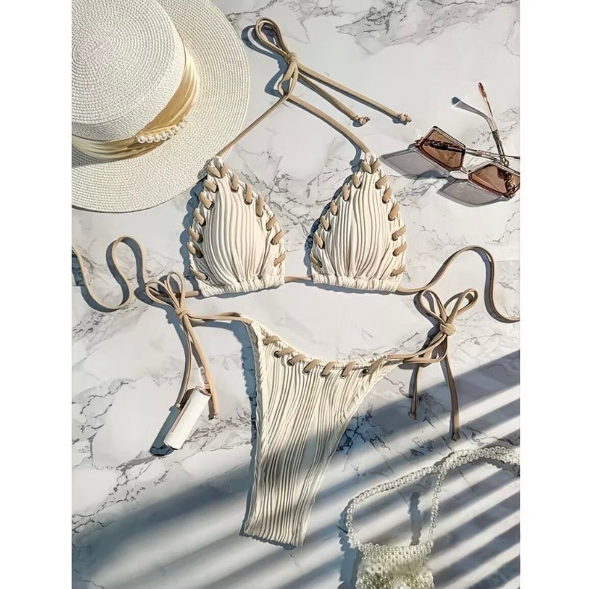 Adoptez l'élégance avec ce bikini en crochet beige. Parfait pour une journée à la plage, sa conception unique offre confort et style. Idéal pour les femmes cherchant à se démarquer avec une touche bohème chic.