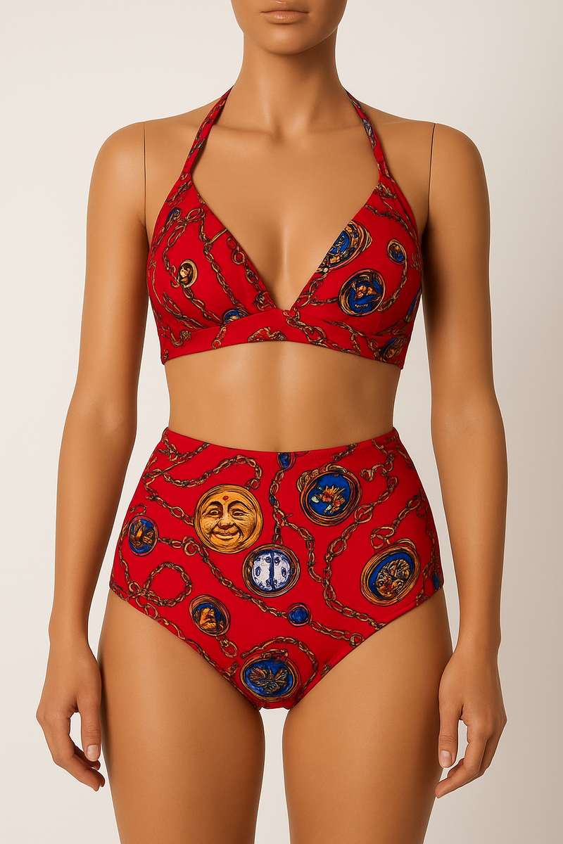 Élégant bikini rouge à imprimé chaîne, parfait pour les journées ensoleillées à la plage ou à la piscine. Conçu pour apporter confort et style, il est idéal pour toutes les femmes qui souhaitent se démarquer. Fabriqué avec des matériaux de haute qualité pour un ajustement parfait.