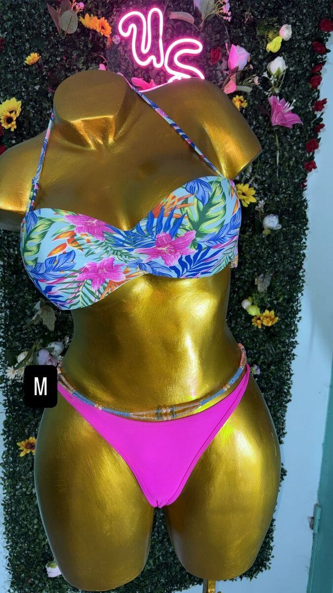 Élégant bikini femme pour un été coloré. Top à motifs tropicaux, bas vibrant et confortable. Parfait pour la plage ou la piscine. Style et confort garantis!