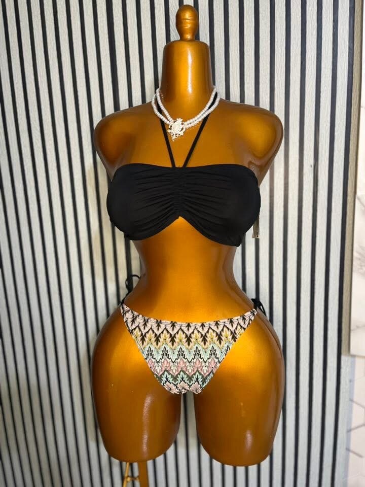 Ce bikini élégant allie un haut bandeau noir chic à un bas imprimé graphique dynamisant. Idéal pour les journées à la plage ou au bord de la piscine, il est conçu pour offrir confort et style. Faites tourner les têtes avec ce look moderne et séduisant qui met en valeur votre silhouette.