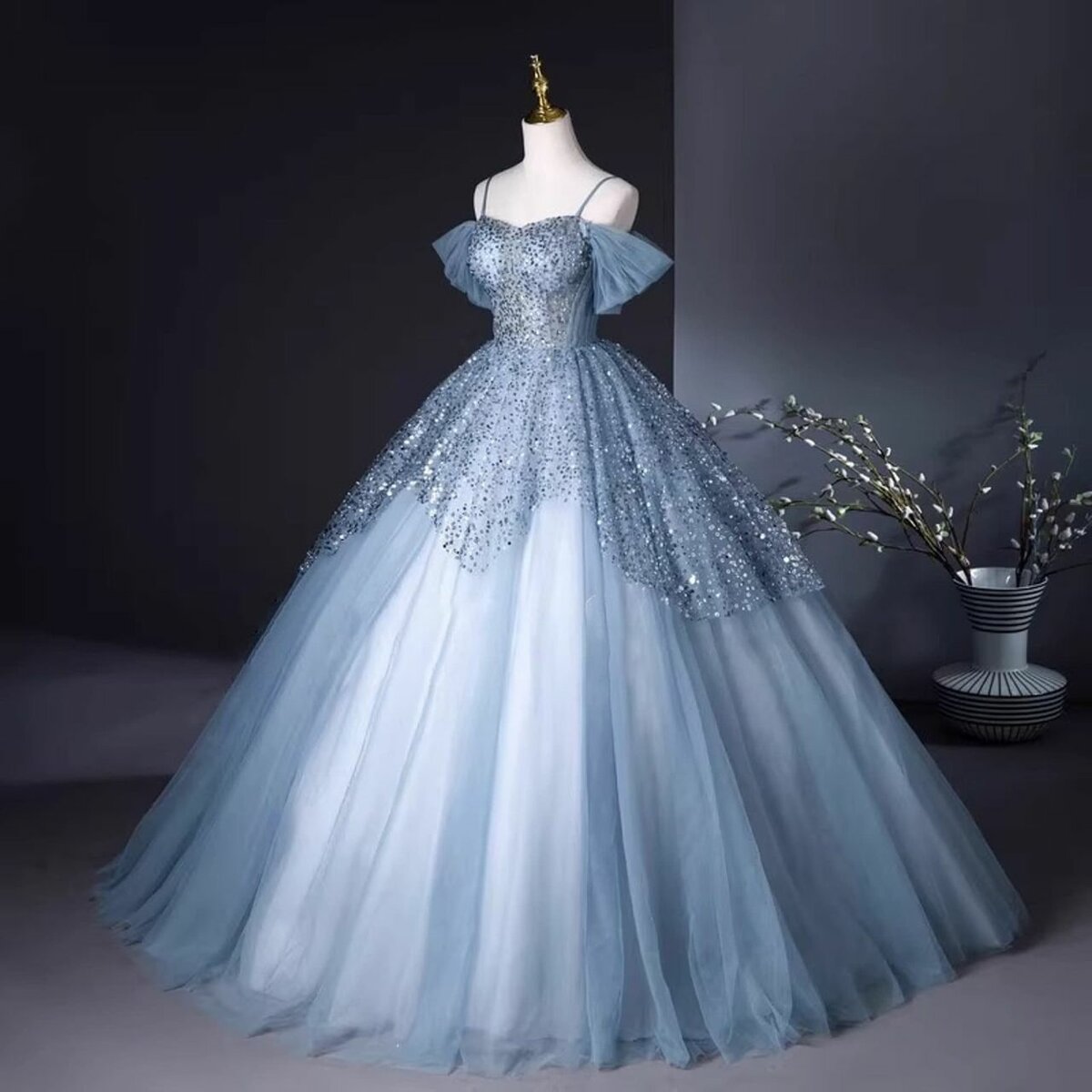 This stunning ball gown features a flowing silhouette, intricate detailing, and a timeless design that exudes grace and sophistication.
