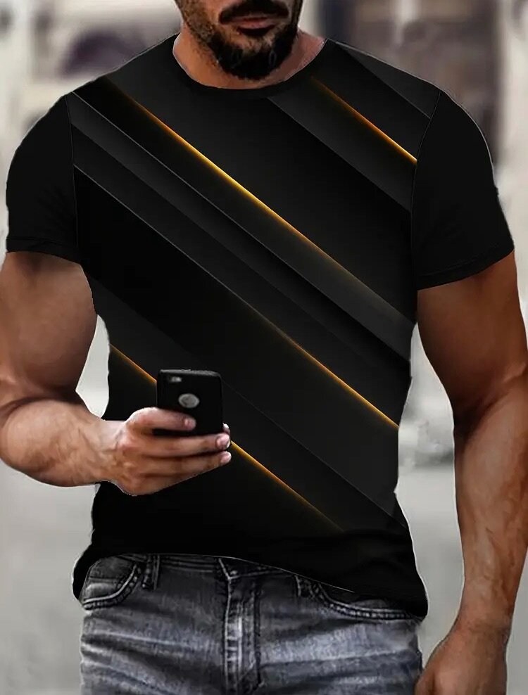 Men's Black 3D Print T-Shirt with Golden Geometric Stripes Casual Short Sleeve Summer Tee for Outdoor Sports, Lightweight Polyester Blend, Round Neck, Machine Washable
