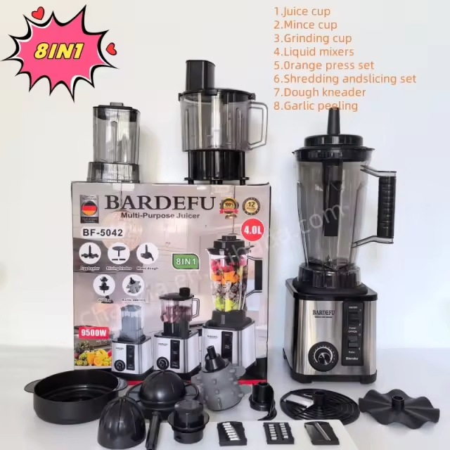 Transformez votre cuisine avec le blender multifonction BARDEFU 8 en 1. Idéal pour presser, hacher, mélanger et bien plus, cet appareil polyvalent de 4.0L est parfait pour les passionnés de cuisine. Préparez jus, purées, et pâtes rapidement grâce à ses accessoires variés. Sa puissance de 950W assure un rendement efficace. Parfait pour toute cuisine moderne!