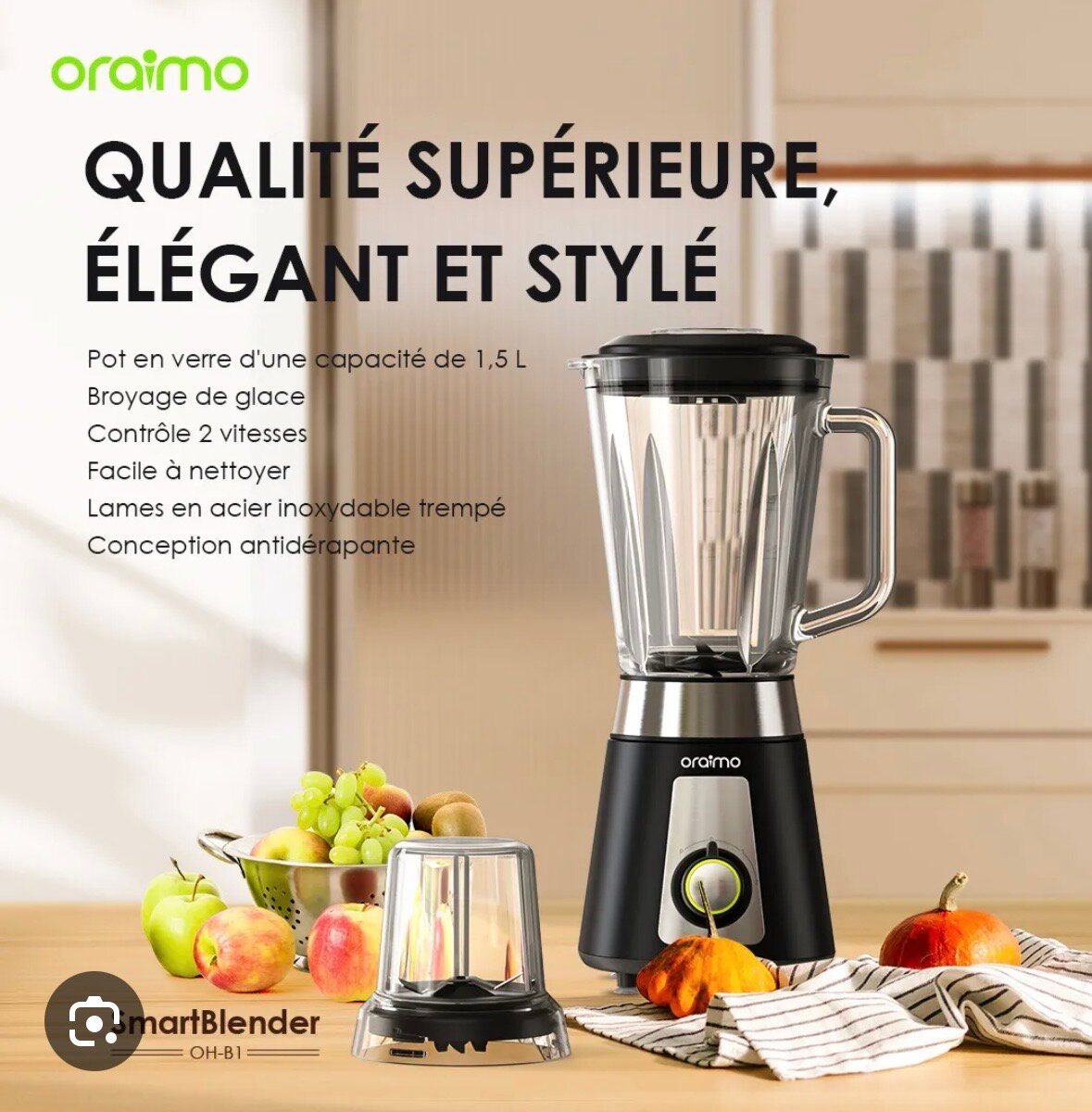 Découvrez le blender Oraimo, parfait pour une cuisine moderne. Avec son pot en verre de 1,5L et ses lames en acier inoxydable, il offre efficacité et durabilité. Idéal pour broyer de la glace et préparations variées grâce à son contrôle 2 vitesses. Facile à nettoyer et doté d'une conception antidérapante, c'est l'outil indispensable pour vos smoothies et soupes. Un choix élégant et fonctionnel pour tous les foyers.