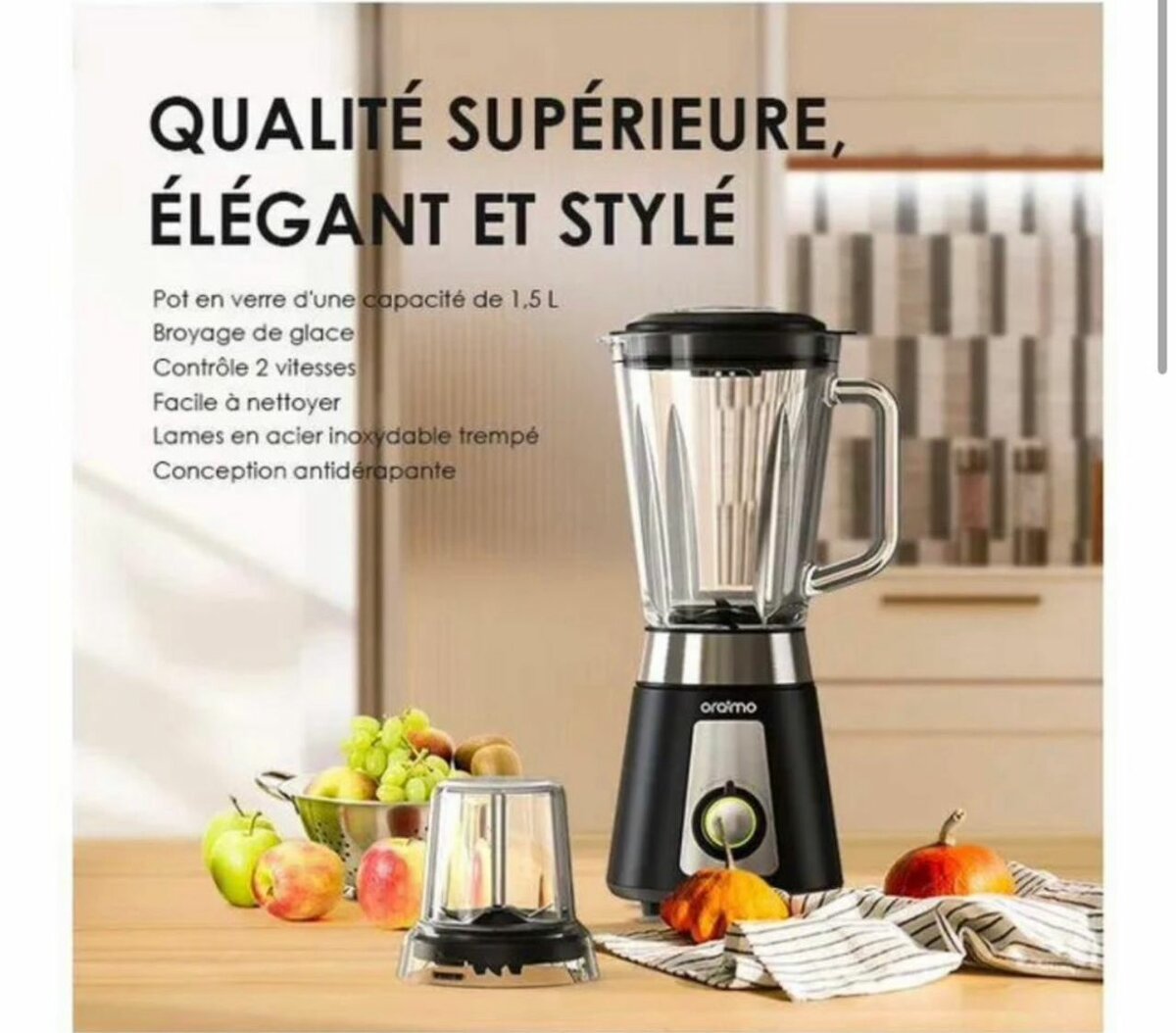 Découvrez le Smartblender Oraimo 1.5L,mélangeur à contrôle vitesse parfait pour vos smoothies et préparations culinaires. Avec ses lames en acier inoxydable et sa capacité à broyer la glace, il est l'outil idéal pour une cuisine moderne. Deux vitesses de contrôle et un design anti-dérapant, propre garantissent une utilisation facile et sécurisée. Parfait pour une utilisation quotidienne.